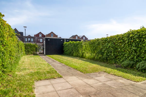 De achtertuin is aangelegd met gras, terras, erfafscheiding met hedera begroeiing en poort. Achterin de tuin staat een houten tuinberging (ca. 6 m2) met wandcontactdoos en verlichting.