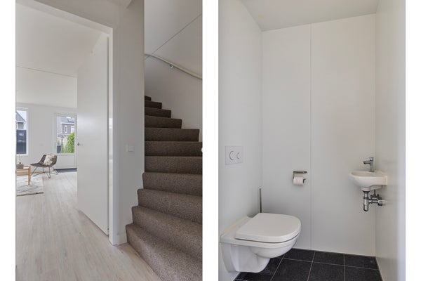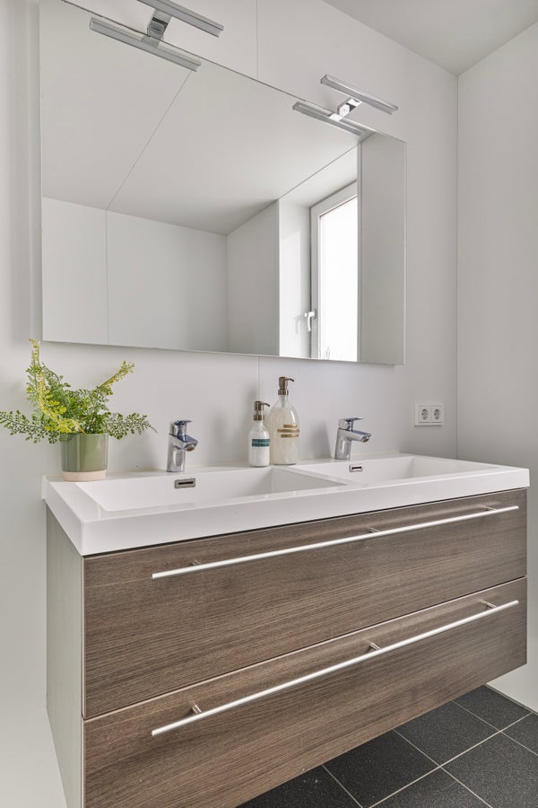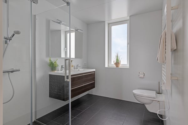 De overloop op de eerste verdieping geeft toegang tot de 3 ruime slaapkamers en de badkamer. De ruime badkamer is voorzien van Vileroy & Boch sanitair zoals een dubbele wastafel met wastafelmeubel, 2e toilet, douche en vloerverwarming.