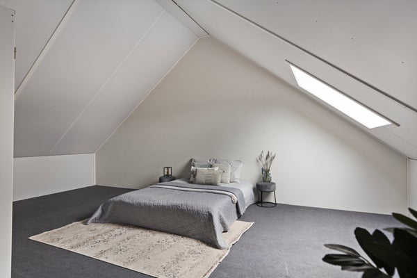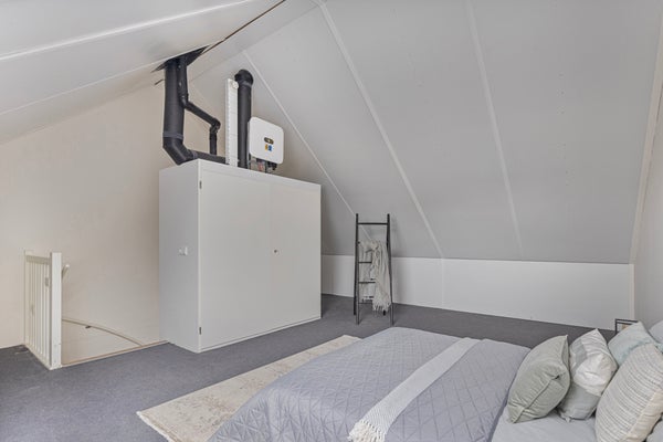 Via een vaste trap bereikt u de ruime zolder voorzien van wasmachineaansluiting en een Velux dakraam. Op deze verdieping is een centrale kastruimte geplaatst, waarin de warmtepomp, omvormer voor de zonnepanelen en WTW-unit zijn gesitueerd.