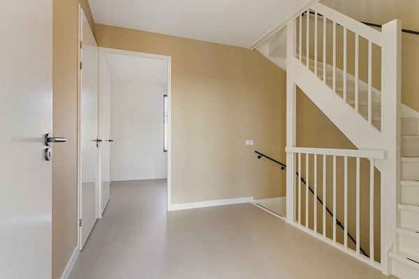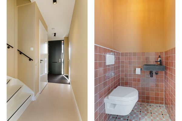 Entree, via de hal die toegang biedt tot het aparte toilet en de ruime woonkamer. Aan zowel de zijde van de woonkamer als de keuken zijn grote glazen schuifdeuren die toegang geven tot de tuin en het kleine terras aan de voorkant.