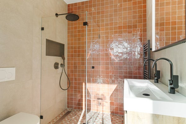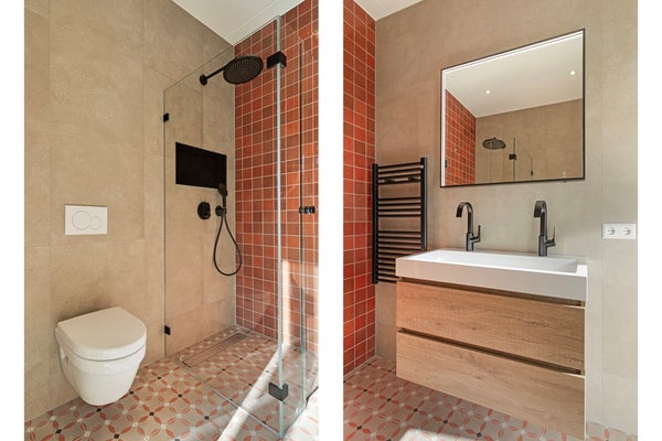 Je neemt de trap naar de eerste verdieping waar je toegang hebt tot 2 slaapkamers en beide badkamers. De eerste badkamer is zeer ruim met een dubbele wastafel en een full-length spiegel erboven. Het heeft een badkamer met douche en een toilet met handdoekradiator. De eerste slaapkamer heeft ruimte voor een tweepersoonsbed en een kast. De master bedroom is zeer ruim en heeft grote glazen deuren die volledig open kunnen. Deze slaapkamer heeft ook een ensuite badkamer met een regendouche, dubbele wastafel, handdoekradiator en toilet.