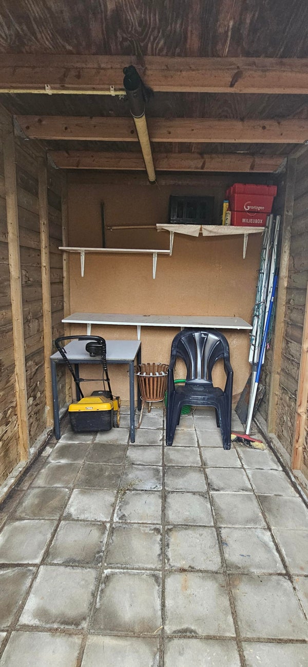 Circa 12m diepe achtertuin (60m²), houten berging en achterom via de brandgang.