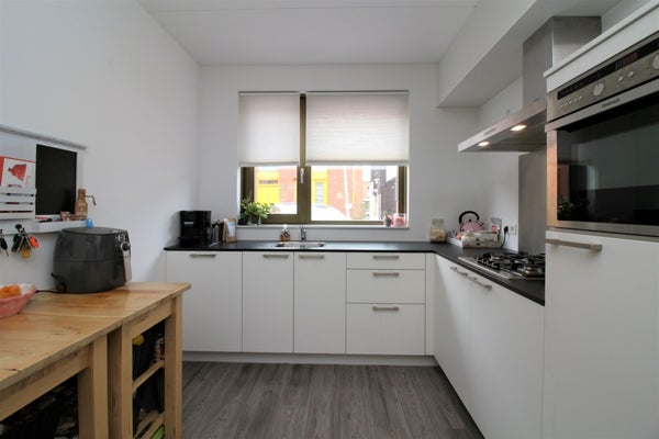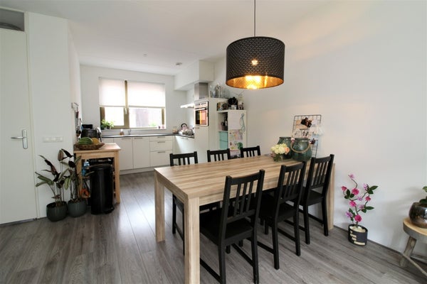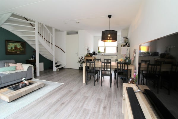 Begane grond: hal/entree met toilet en meterkast, ruime tuingerichte woonkamer met open keuken (totaal ca. 36 m2), openslaande deuren naar de tuin en een separate loopdeur. Open trap naar de verdieping. Nette keukeninrichting (wit, hoekopstelling, aan de voorzijde) v.v. koelvriescombi, vaatwasser, ovenmagenetroncombi, gaskookplaat en afzuigkap.
