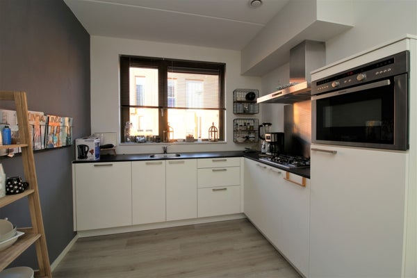 Begane grond: hal/entree met toilet en meterkast, ruime tuingerichte woonkamer met open keuken (totaal ca. 36 m2), openslaande deuren naar de tuin en een separate loopdeur. Open trap naar de verdieping. Nette keukeninrichting (wit, hoekopstelling, aan de voorzijde) v.v. koelvriescombi, vaatwasser, oven-magenetroncombi, gaskookplaat en afzuigkap.