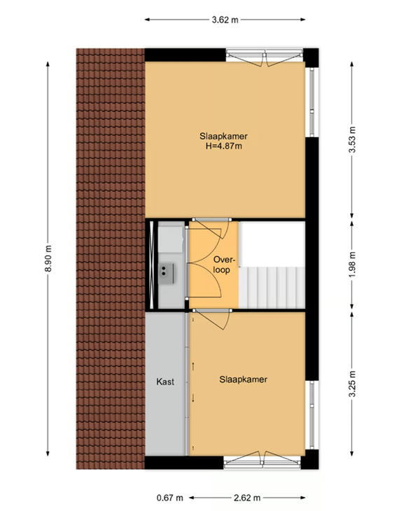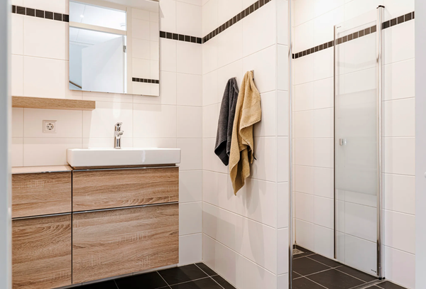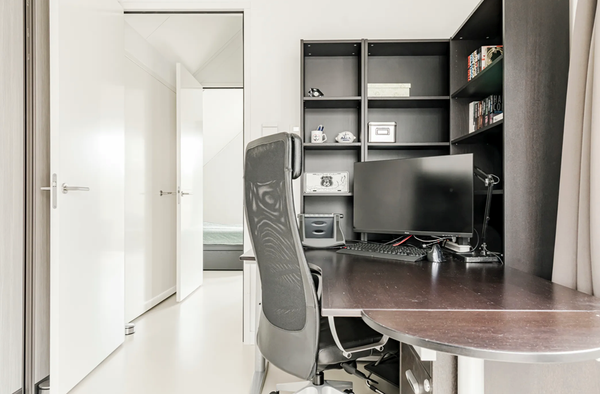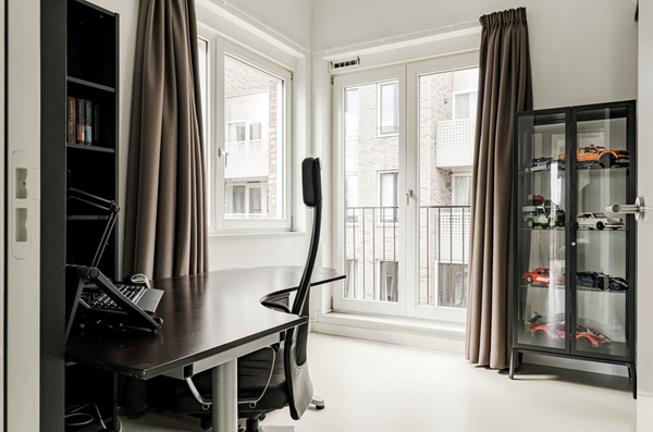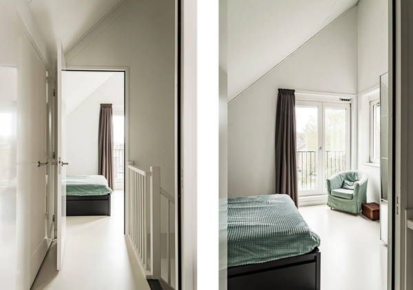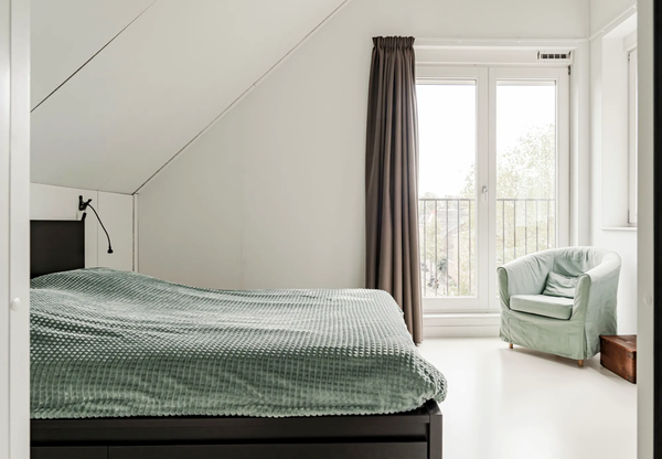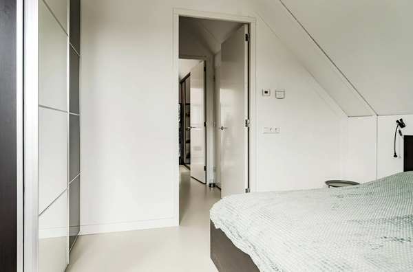 Overloop met afgesloten technische ruimte waar de cv-ketel (Intergas 2014), mechanische ventilatie en aansluitingen voor wasmachine en droger zijn. Op deze verdieping bevinden zich nog twee slaapkamers, beide met Franse balkons en hoge plafonds tot aan de nok, wat zorgt voor een ruimtelijk en licht gevoel.