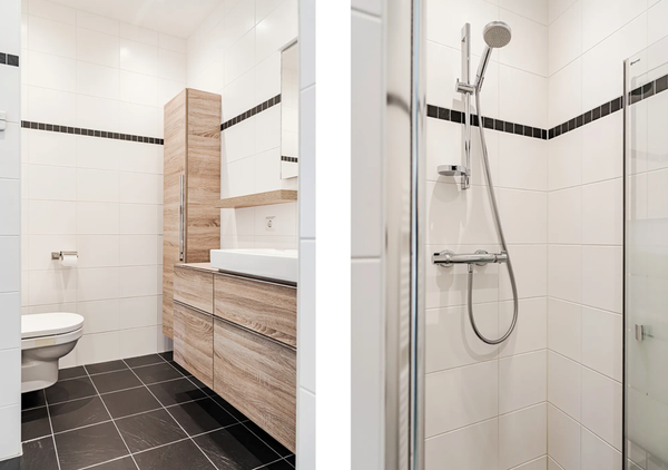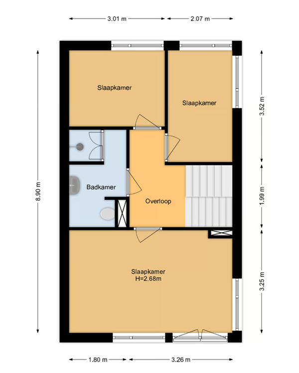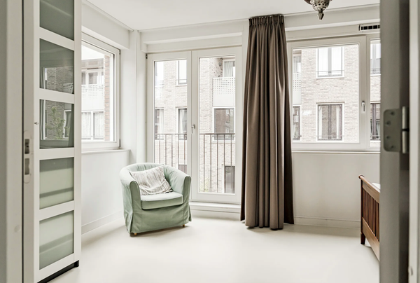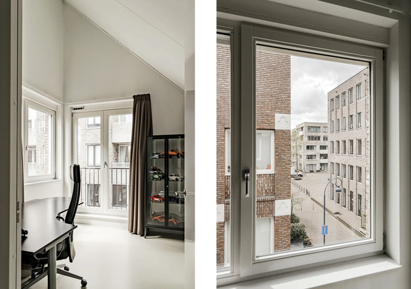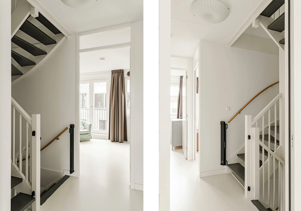 Overloop met toegang tot drie slaapkamers: de ruime slaapkamer aan de voorzijde beschikt over openslaande deuren met Frans balkon, terwijl de twee slaapkamers aan de achterzijde uitkijken op de rustige binnentuin. De moderne badkamer is voorzien van een inloopdouche met glazen deuren, wastafelmeubel met extra kastruimte, handdoekradiator en tweede toilet.