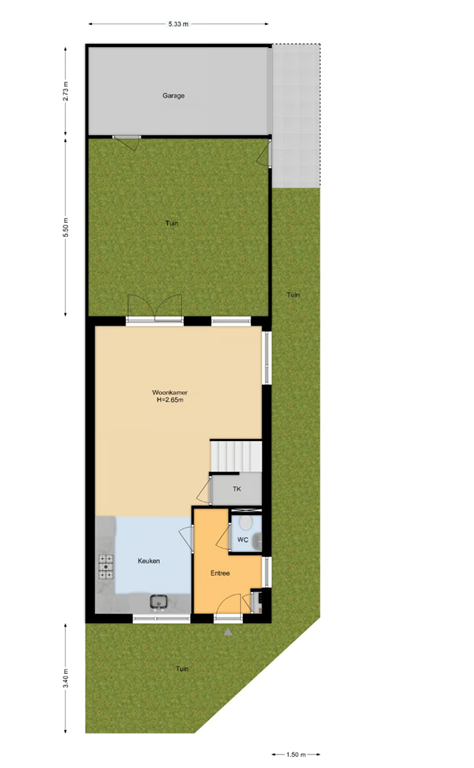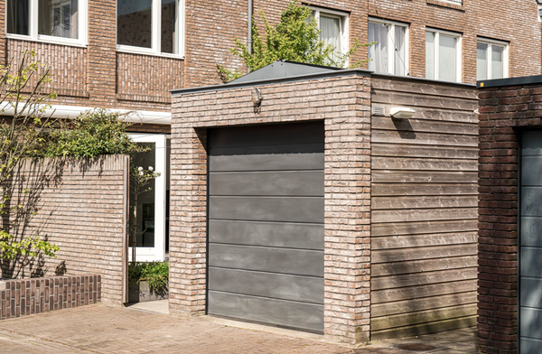 Vanuit de tuin is toegang tot de privégarage, uitgerust met een elektrische roldoor en extra ruimte voor fietsen of opslag.