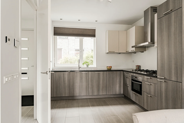 Entree met ruime hal, garderobe, meterkast en modern toilet met fontein. De lichte woonkamer beschikt over grote raampartijen en openslaande deuren naar de op het zuidoosten gelegen tuin, waardoor een prettige verbinding ontstaat tussen binnen en buiten. Aan de voorzijde bevindt zich de open keuken, voorzien van hoogwaardige inbouwapparatuur, waaronder een Quooker, vaatwasser, koelkast, vriezer, combi-oven/magnetron, 5-pits gaskookplaat en afzuigkap. De gehele begane grond is afgewerkt met houtlook vloertegels en voorzien van vloerverwarming.
