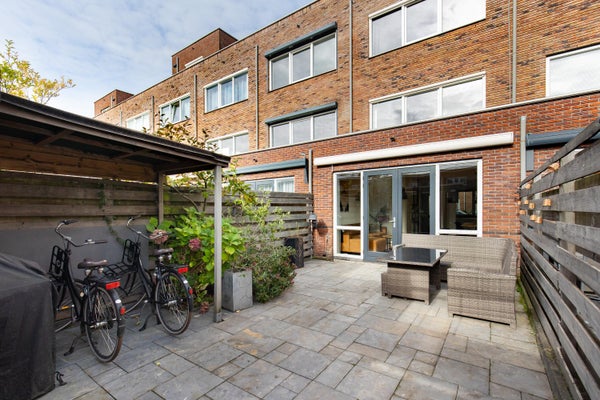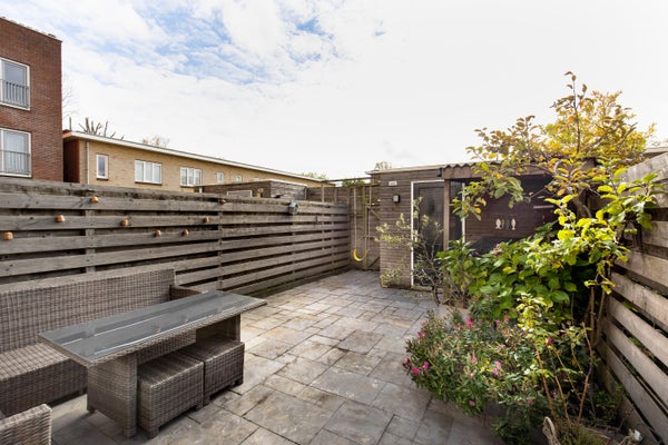 Middels openslaande deuren heb je toegang tot de zonnige achtertuin op het zuiden met elektrisch zonnescherm. In de tuin is een vrijstaand houten schuur aanwezig en achterom.