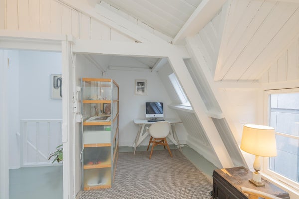 Aan de achterzijde ligt een lichte werkkamer met groot raam en uitzicht op de tuin. De sfeervolle serre met schuifpui vormt de verbinding tussen woonkeuken en achtertuin en is een heerlijke plek om het hele jaar door van het buitengevoel te genieten.