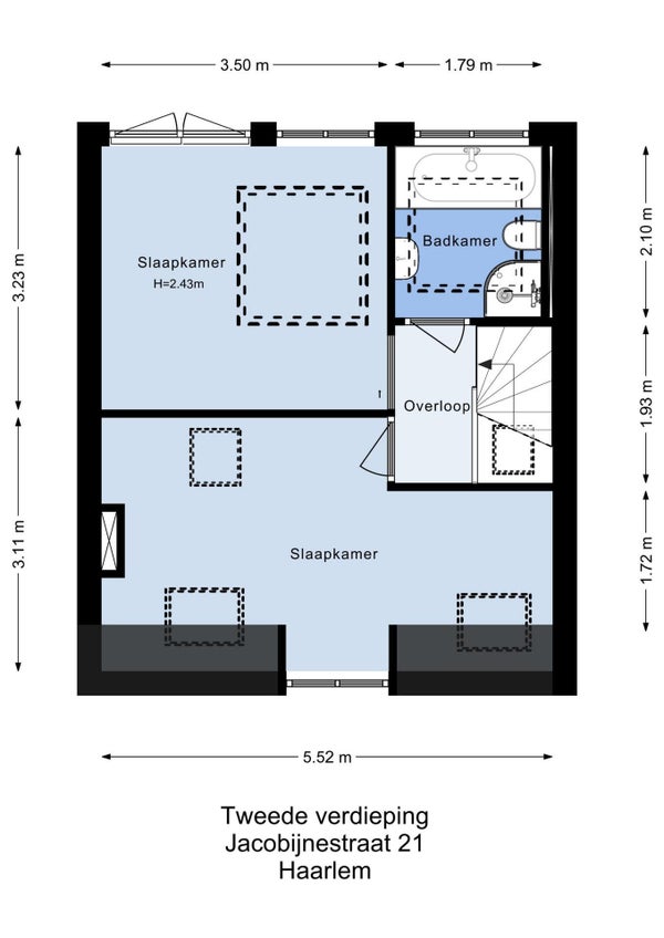 Tweede verdieping: Overloop met toegang tot de tweede badkamer, compleet uitgevoerd met ligbad, douche, wastafel, toilet en vloerverwarming. Op deze verdieping bevinden zich tevens twee goede slaapkamers:
