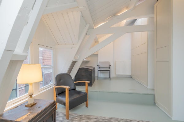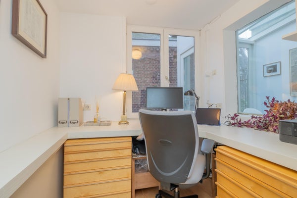 First floor: Here you'll find the spacious and exceptionally bright living room with a wood-burning stove and beautiful high windows. A charming living space with views of the charming city center. At the rear is a second office or study with a view of the Hortus botanicus.
