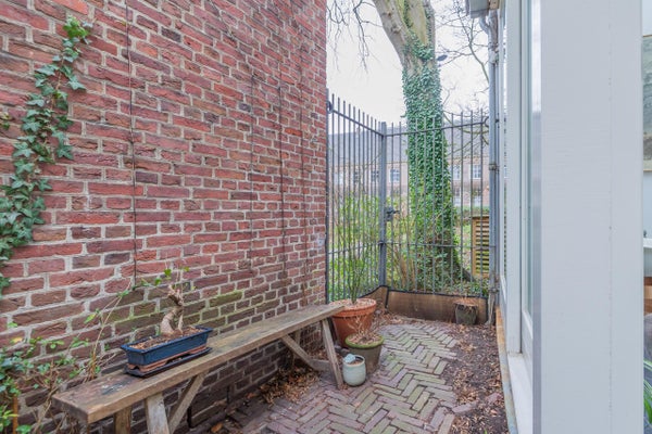 The sunny back garden includes a storage shed, and a traditional gate provides direct private access to the Hortus Medicus, a unique green oasis in the heart of the city.