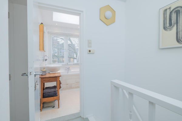 De hal geeft toegang tot de eerste badkamer, voorzien van vloerverwarming, toilet, wastafel en inloopdouche. Tevens staat hier de wasapparatuur opgesteld.