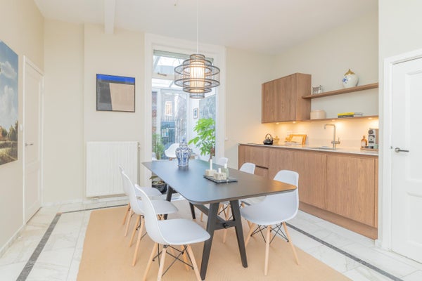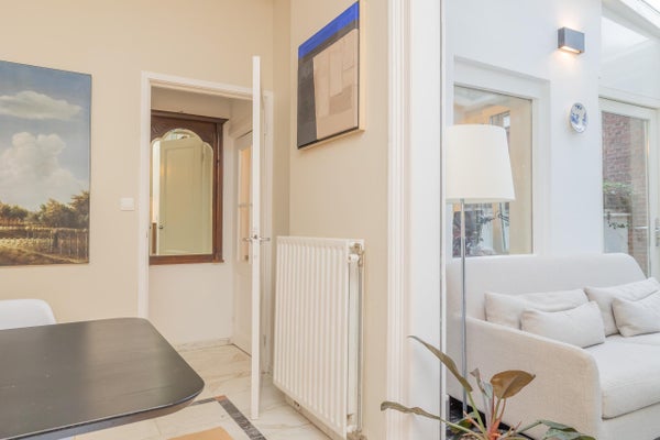 This characterful house from 1895 exudes charm. Authentic details such as the high ceilings, large windows, the beautiful marble floor on the ground floor, and the characteristic front door have been carefully preserved. Thanks to the tall windows, the house enjoys beautiful natural light.