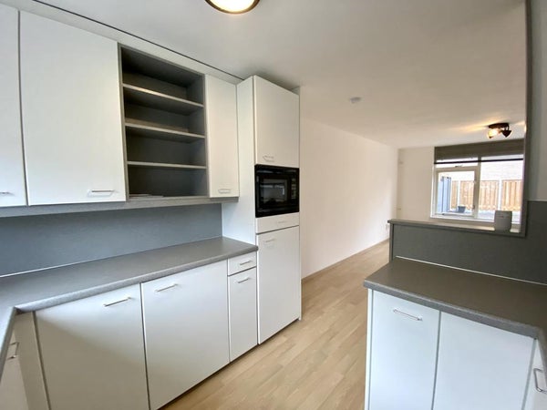 Er is aan devoorzijde van de woning een keurige halfopen keuken welke is voorzien van alle gemakken, zoals een inductie kookplaat, vaatwasser, aparte vriezer en combimagnetron. In de trapkast is extra bergruimte. Aan de rechterkant van de woonkamer is een extra ruimte waar je alle kanten mee op kunt; zoals bijvoorbeeld een thuiskantoor of speelkamer. Of misschien wil je hier wel de woonkamer of eetkamer situeren?