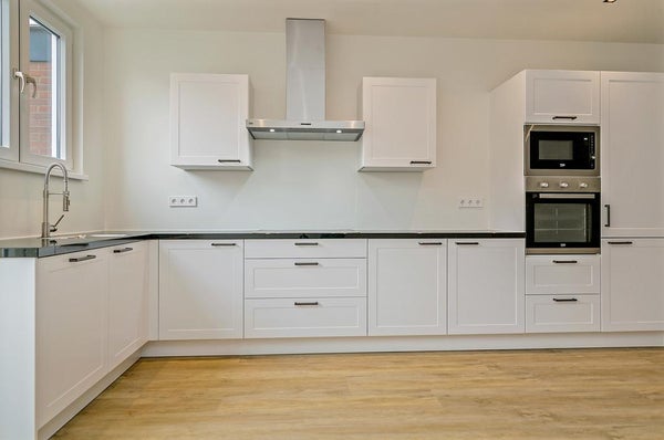 Begane grond: entree, ruime hal met apart toilet, lichte woonkamer (met vloerverwarming) met open leefkeuken voorzien van alle gemakken.