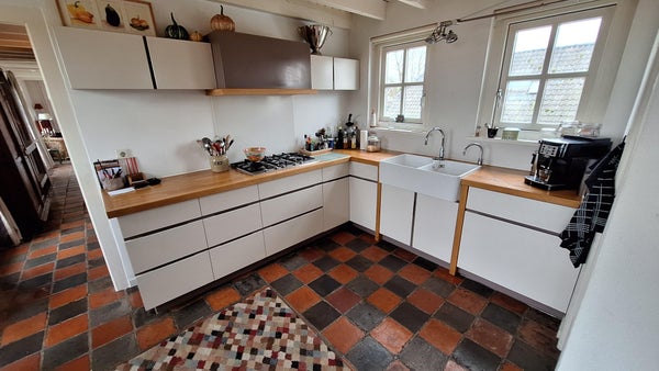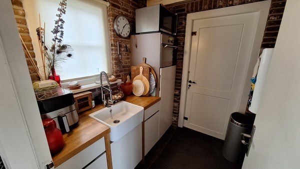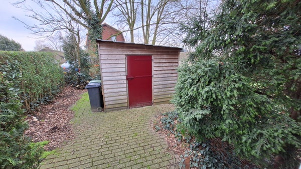 De tweede woonkamer geeft toegang tot de keuken in hoekopstelling. Deze is voorzien van alle apparatuur zoals gasfornuis, afzuigkap, koelkast en combi magnetron. Naast de keuken treft u een bijkeuken en een zij entree. Via deze entree bereikt u een vrijstaande houten schuur / berging en bereikt u via een trap de achtertuin een verdieping lager. Hier beschikt de woning over een werkruimte / kantoorruimte met eigen entree en toilet. In dit souterrain heeft u verder een kleine bergruimte en een tweede kamer die toegang geeft met openslaande deuren tot een terras. Het souterrain is ook bereikbaar via een trap in de centrale hal bij de voordeur.