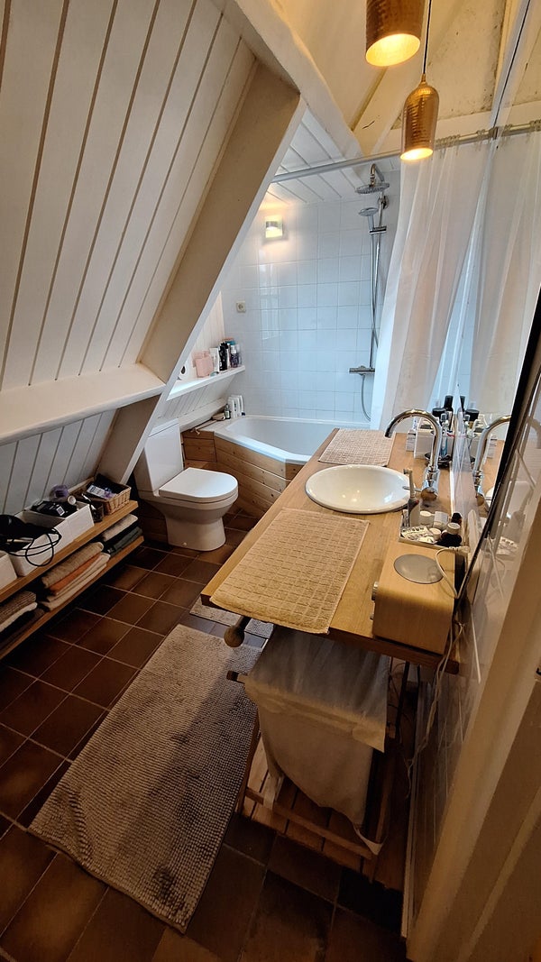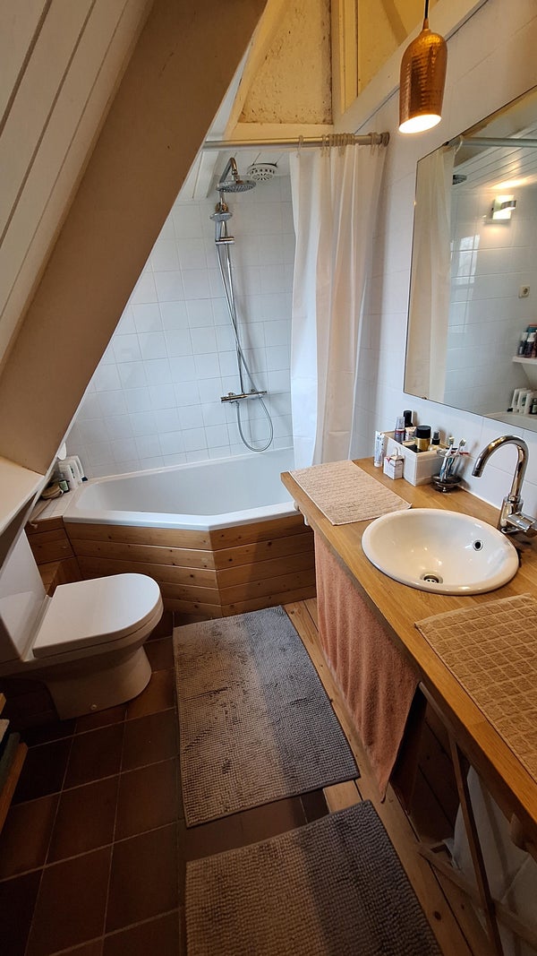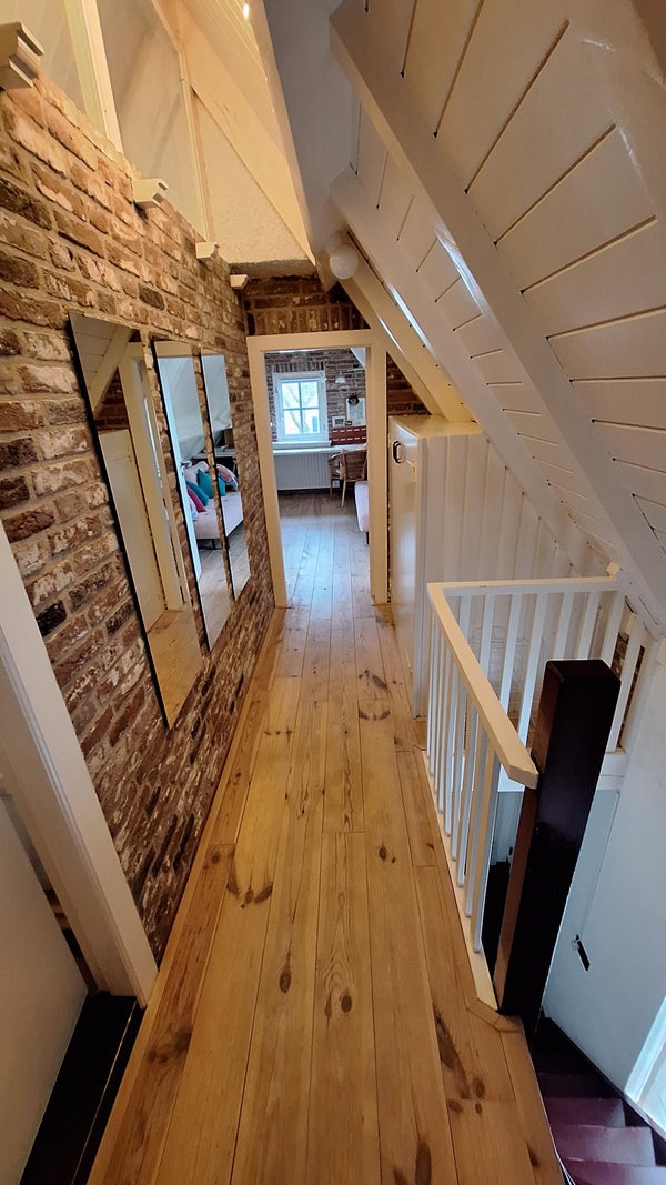 Op de eerste verdieping bevinden zich twee ruime slaapkamers, een kleinere slaapkamer en badkamer. De badkamer is voorzien van toilet, wastafel en ligbad. De verdieping kenmerkt zich door een landelijke afwerking met veel hout.