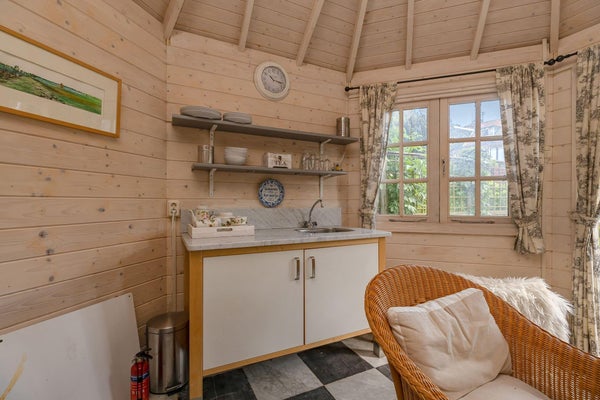 Entree, hal met apart toilet en wasruimte, zeer royale woonkamer met twee zitgedeeltes, ruime open keuken van alle gemakken voorzien met aansluitend de ruim opgezette eettafel en openslaande deuren naar de ruime achtertuin. In de diepe bostuin is nog een ruim chalet/tuinhuis aanwezig die als tuin- of werkkamer kan fungeren.