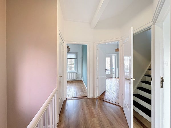 Op de ruime overloop bevindt zich een groot glas in lood raam, een modern toilet en een bergkast. Er is een zijkamer en twee slaapkamers, één aan de voorzijde met toegang tot een balkon, en één aan de achterzijde die eveneens over een balkon beschikt. De moderne badkamer, die in 2021 is vernieuwd, is voorzien van een inloopdouche, een wastafelmeubel en een bad.