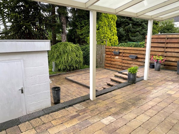 Riante, geheel omsloten, achtertuin (18 x 11/8,5 m). De achtertuin is fraai aangelegd en uitgerust met een groot bestraat terras (8,5 x 3,75 m) met overkapping (6,5 x 3,5 m), stenen berging (2,50 x 2,50 m) en achterom ingang.