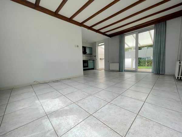 Doorzon woonkamer (5,95 x 3,55 m) voorzien van tegelvloer en schuifpui naar achtertuin.