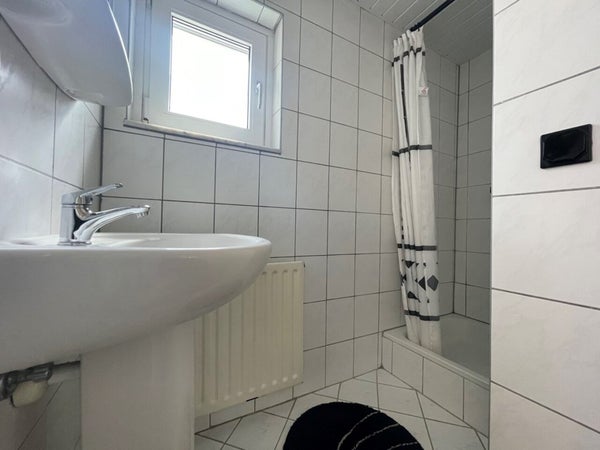 Geheel betegelde badkamer (2,25 x 1,10/0,80 m) uitgerust met een wastafel en douche.