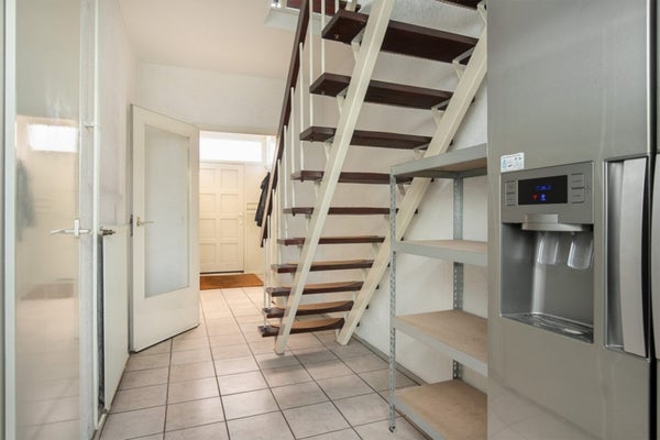 Entree met hal en veel extra bergruimte onder de trap. Toegang tot de inpandige garage (ca. 15 m²). Aan de tuinzijde bevindt zich een ruime multifunctionele tuin-/slaapkamer, een