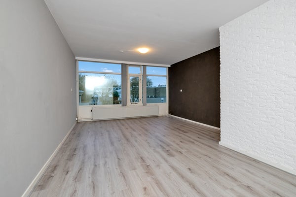 en een nieuwe laminaatvloer. De lichte woon-/eetkamer beschikt over grote raampartijen.
