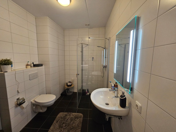 * Complete badkamer met wandcloset, inloopdouche met douchewand en wastafel met spiegel