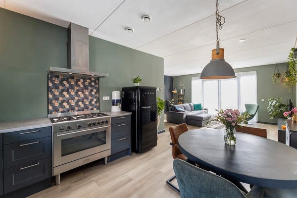 De halfopen keuken is uitgerust met alle benodigde inbouwapparatuur zoals een gasfornuis, afzuigkap, combi-oven, koel-vriescombinatie en een vaatwasser.