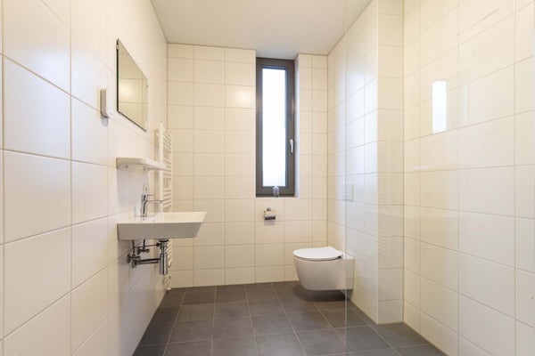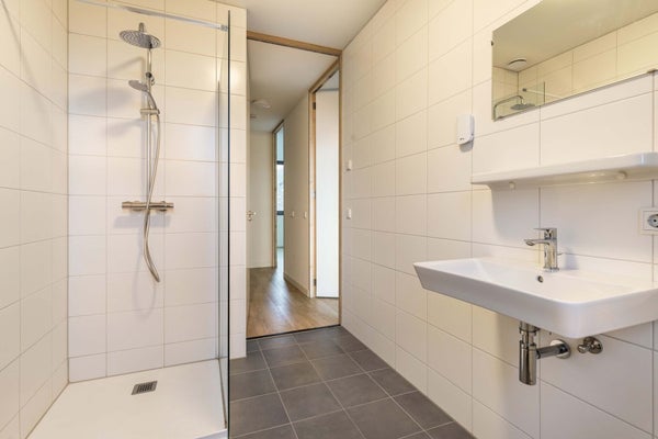 Op de eerste verdieping vind je twee grote slaapkamers van 20m2 en 13m2 en een badkamer met elektrische handdoekradiator. De badkamer is voorzien van een tweede toilet en wastafel met spiegel. De douche voorzien van een douchescherm.