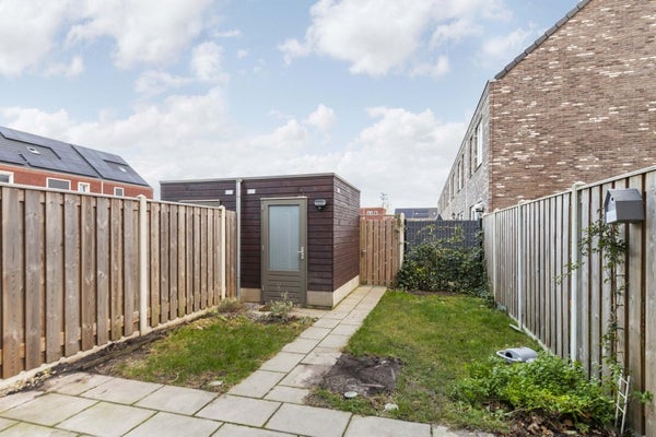 Vanuit de woonkamer kom je uit in de tuin. De tuin is al voorzien van een terras met een diepte van bijna 3 meter over de gehele breedte van de woning en er is een buitenkraan. Vanaf het terras loopt een pad met links en rechts gras naar de berging en het achterpad. De berging is voorzien van lichtpunt en wandcontactdoos. Handig voor bijvoorbeeld het opladen van je elektrische fiets. Aan de achterzijde van de tuin komt een afsluitbare poort.