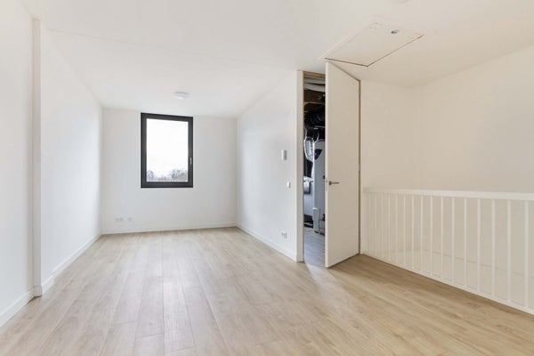 Vanaf de overloop loop je met een vaste trap naar de tweede verdieping. Daar vind je de derde slaapkamer van 15m2 een grote open ruimte van ca. 25m2 die vrij kunt indelen. Op de tweede verdieping vind je ook de technische ruimte met de warmtepomp en een aansluiting voor een wasmachine en wasdroger.