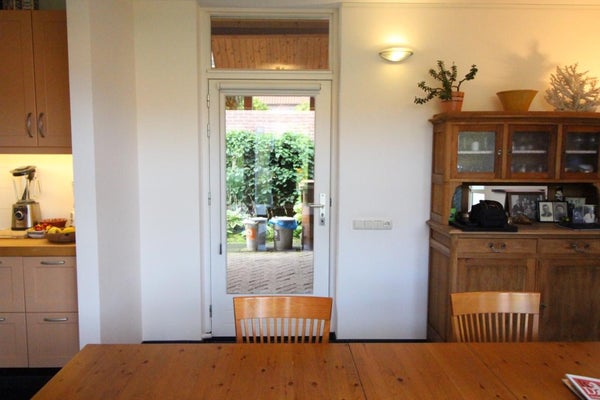 Vanuit de eetkamer is er toegang tot de fraai aangelegde, onderhoudsvrije tuin met een berging – perfect voor het stallen van fietsen.