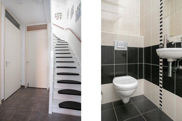 De woning is aan een rustig plein gelegen met een grote speeltuin. Via de voordeur bereik je de hal, met daaraan gelegen het separaat toilet, de inpandige ruime berging en een slaapkamer aan de voorzijde. De berging is voorzien van rekken en planken. Via de berging bereik je de achterkant van de woning waar een parkeerplaats aanwezig is waar u de auto kunt parkeren. Via de trap in de hal bereikt u de eerste etage.