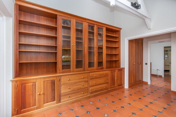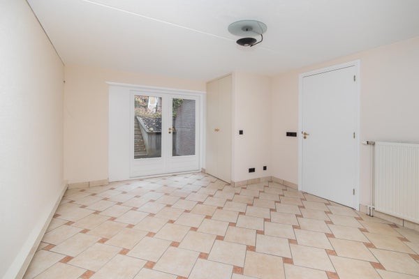 Vanuit de entree bereikt u de ruime hal met toilet en een studeer/-werkkamer met grote kastenwand en openslaande deuren naar buiten— ideaal voor wie rustig wil werken of studeren.