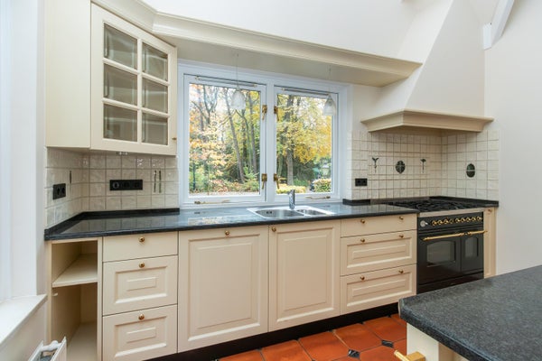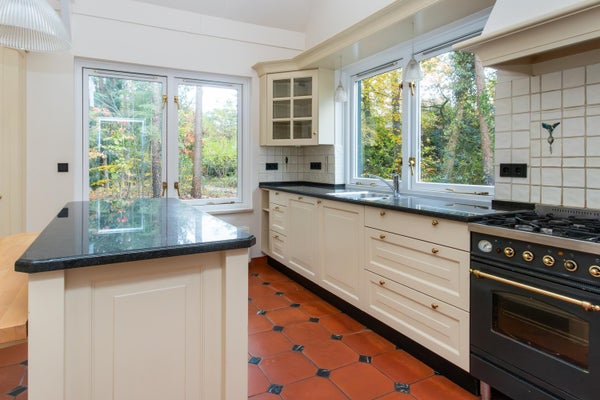 Ruime woonkeuken met een fantastisch uitzicht over de tuin. De keuken is compleet uitgerust met alle apparatuur, waaronder een groot gasfornuis met oven, koelkast, vriezer en vaatwasmachine. Aansluitend bevindt zich de lichte en ruime woonkamer met openhaard en ook hier vrij uitzicht.