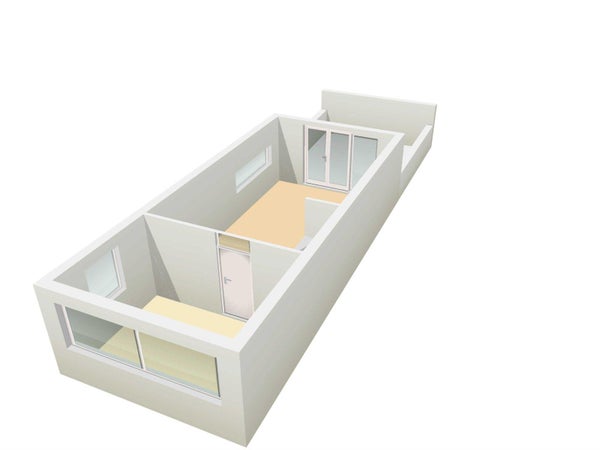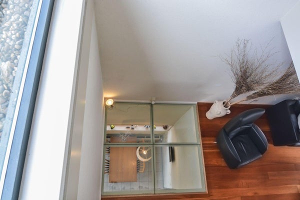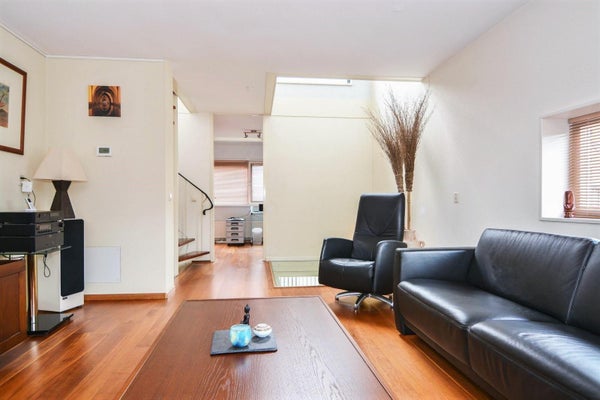 Verdieping: grote woonkamer v.v. parketvloer en openslaande deuren naar royaal zonnig terras op het zuiden, ruime slaap-/werkkamer aan de voorzijde. Een fraai element is de vide tussen de begane grond en de woonkamer die dicht gemaakt is door middel van een glazen (beloopbaar) plateau. Hierdoor is de leefruimte vergroot en het speelse en wordt het transparante karakter van de woning versterkt.