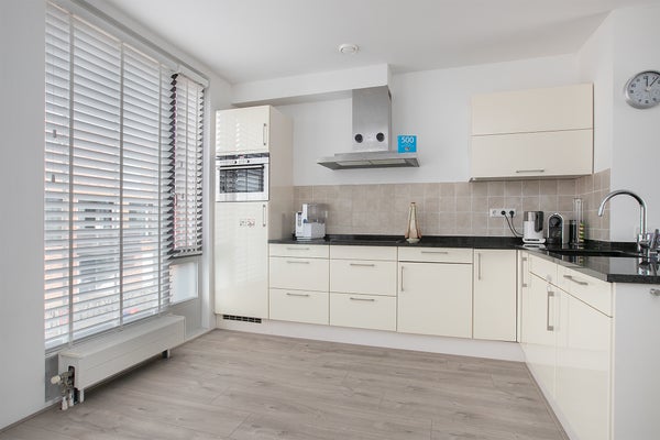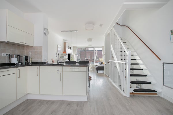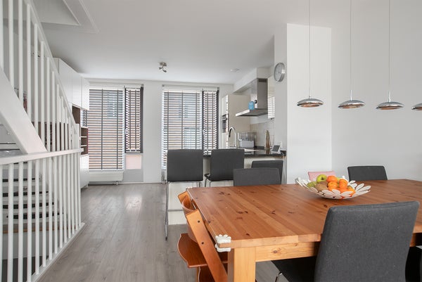 Op de eerste verdieping bevindt zich de ruime woonkamer met open keuken. De keuken is modern uitgevoerd en voorzien van diverse inbouwapparatuur, waaronder een inductiekookplaat, koelkast, vriezer, vaatwasser en combi-oven. Er is volop kastruimte aanwezig. Aan de achterzijde van de woonkamer ligt het balkon (Zuid).