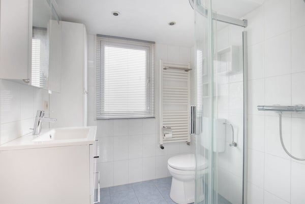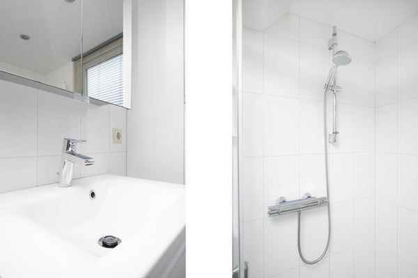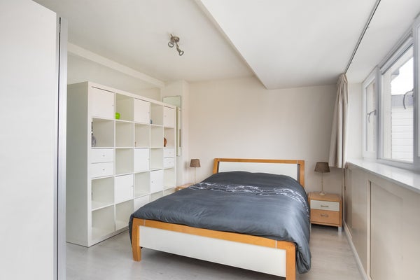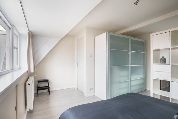 Vanuit de hal is via de trap toegang tot de eerste verdieping, via de overloop is de badkamer en ruime slaapkamer te bereiken. De badkamer is voorzien van een 2e toilet, is tot aan het plafond betegeld, nette douchecabine, thermostaatkraan, wastafel met meubel en spiegel, inbouwspots en designradiator. De slaapkamer is over de gehele lengte van de woning, heeft een lichtgrijze laminaatvloer, een 2-persoonsbed, nachtkastjes, bureau, grote kledingkast, kledingkast en raampartijen aan beide kanten.