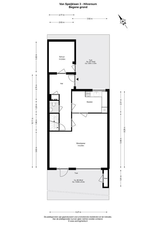 Begane grond: entree, hal, toilet, ruime woonkamer, open keuken, voor en achtertuin met garage.
