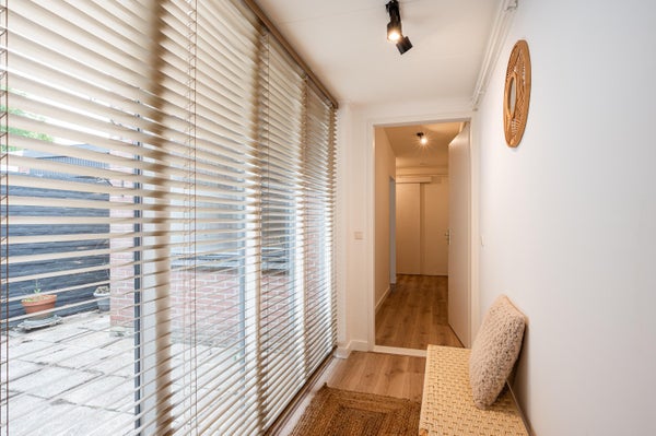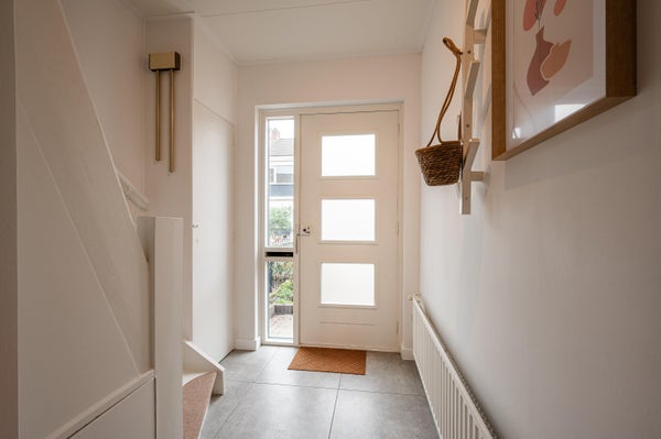 Entree in de hal met toegang tot het toilet, de doorzonwoonkamer en de moderne keuken voorzien van diverse inbouwapparatuur.