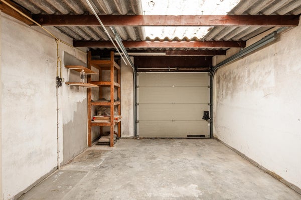 Aansluitend bevinden zich de bijkeuken en een gang met toegang tot een slaapkamer en een badkamer met toilet en wastafel. Daarnaast zijn er een wasruimte en een garage aanwezig — ideaal voor opslag of het parkeren van een auto.