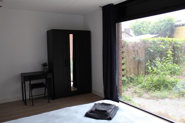 De woning kent een ruime entree op de begane grond, waar zich tevens een woonkamer, slaapkamer en badkamer bevinden. Aan de achterzijde van het appartement is de slaapkamer gesitueerd, waarvandaan u direct ook toegang heeft tot de tuin. Vanuit de woonkamer is de keuken bereikbaar, die is voorzien van koelkast met vriezer, gasfornuis, afzuigkap en combi-oven/magnetron. Tot slot is de begane grond voorzien van eigen badkamer met ruime douche, wastafelmeubel en toilet.