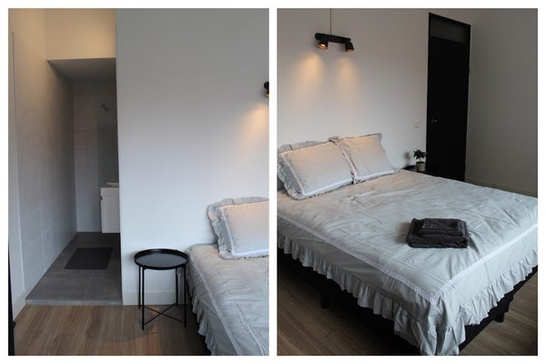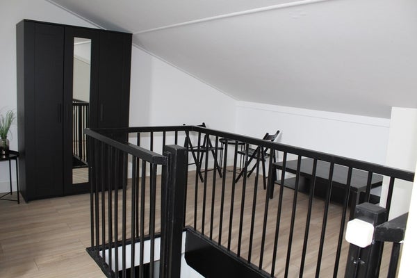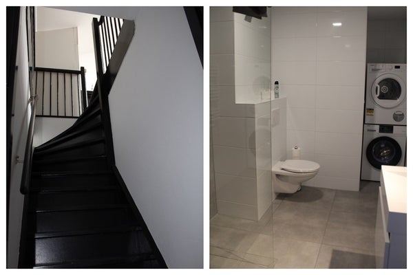 Op de eerste verdieping vinden we de tweede woonkamer en open keuken met inbouwapparatuur, een separaat toilet, de master-bedroom en een badkamer met was- en droogmachine. De tweede verdieping kent nog eens 2 slaapkamers, een moderne badkamer met inloopdouche en toegang tot de derde verdieping, de zolderverdieping, waar de laatste slaapkamer is gerealiseerd. De woning kent een industriele inrichting en de slaapkamers zijn ingericht met gelijkwaardige bedden en kledingkasten.