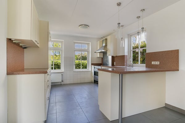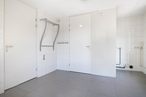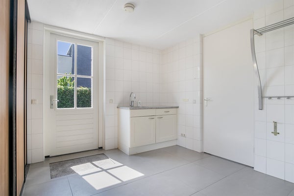Vanuit de woonkamer is er toegang tot de bijkeuken met keukenblok en inbouwkast. Technische ruimte voor wasmachine en droger en deur naar de achtertuin.
