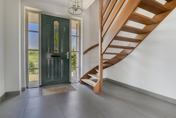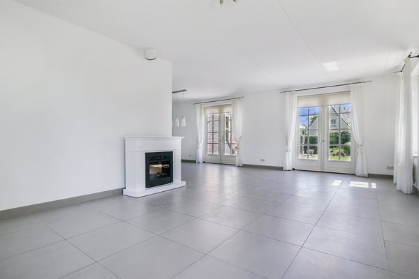 Entree in ruime hal met trap naar de eerste verdieping, meterkast en toegang tot de ruime en lichte woonkamer. L-vormige woonkamer met meerdere openslaande deuren naar het terras.
