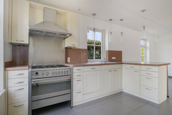 Half-open keuken voorzien van inbouw apparatuur zoals Smeg gasfornuis (6-pits) met grote oven, afzuigkap, koel-/vriescombinatie en vaatwasser.